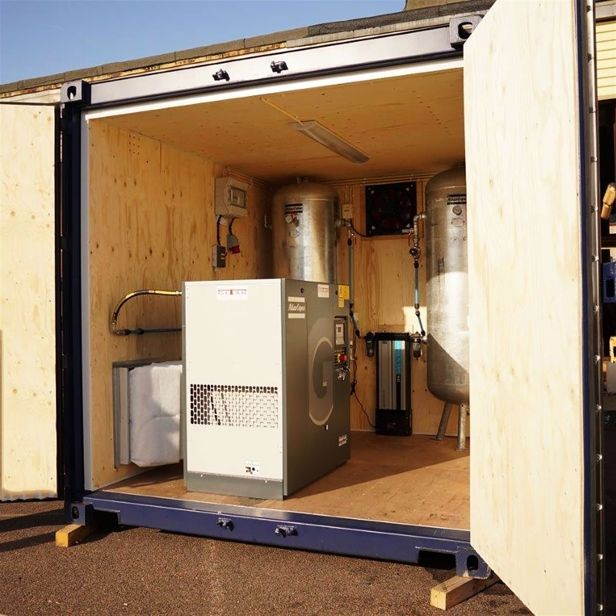Containerlösning med skruvkompressor på 5 kW och en adsorbtionstork som torkar luften ner till – 40 °C tryckdaggpunkt.